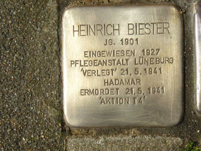 Am 22.11.2019 wurde ein Stolperstein für Heinrich Biester vor der „Euthanasie“-Gedenkstätte am Wienebütteler Weg 1 verlegt.