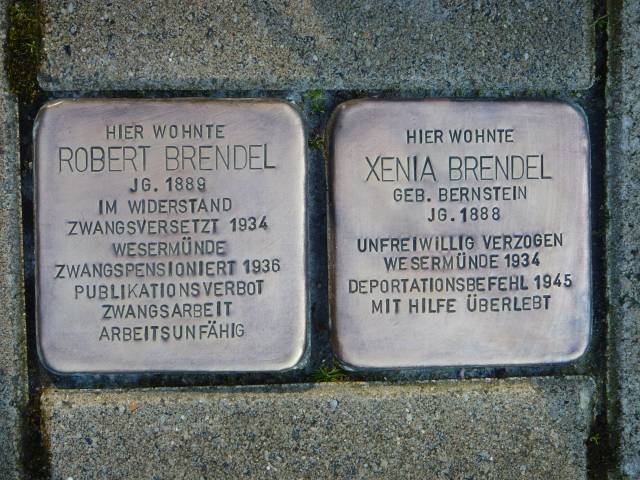 geb. 1889 in Mexico und seine jüdische Frau Xenia Brendel, geb. 1888 in Russland, geb. Bernstein zogen 1919 nach Lüneburg. Sie bekamen drei Töchter. Robert Brendel war Studienrat an der Wilhelm-Raabe-Schule und ab 1934 zwangsversetzt nach Wesermünde. 1936 wurde er aufgrund seiner „Mischehe“ in den Ruhestand versetzt. Als Xenia Brendel 1944 nach Theresienstadt deportiert werden sollte, tauchte sie in Hamburg unter und überlebte. Robert Brendel starb 1947, seine Frau Xenia 1986.