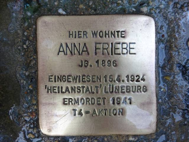 Am 27.02.2009 wurde ein Stolperstein für Anna Friebe in der Rotehahnstraße 20 verlegt.