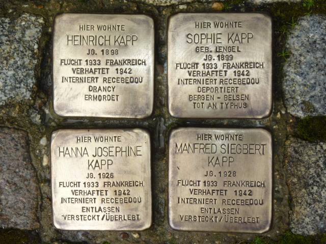 geb. 1899 in Dabrowa, geb. Lengel und Heinrich Kapp, geb. 1898 in Hechtsheim, betrieben ein kleines Kurzwaren- und Wäschegeschäft in Lüneburg. Sie bekamen 2 Kinder: Hanna Josephine, geb. 1926 und Manfred Siegbert, geb. 1928. Die jüdische Familie Kapp flüchtete 1933 nach Frankreich (Straßburg). Ab 1934 lebte sie in Toulouse. Heinrich Kapp wurde nach mehrmaligen Verhaftungen 1939/1942 in das Lager Recebedou (bei Toulouse) interniert und später in das Lager Drancy überstellt. Vermutlich wurde er nach Deutschland deportiert und in einem Konzentrationslager ermordet. Sophie Kapp wurde 1942 mit ihren Kindern ebenfalls in Recebedou interniert. Nach ihrer Entlassung versteckten sich Mutter und Kinder in Frankreich. Nur einige Monate vor der Befreiung vom Faschismus wurde Sophie Kapp verhaftet und in das Konzentrationslager Bergen-Belsen deportiert. Dort starb sie. Die Kinder Hanna Josephine und Manfred Siegbert, überlebten in Frankreich mit Unterstützung jüdischer und nichtjüdischer Freunde und konnten später in die USA übersiedeln.