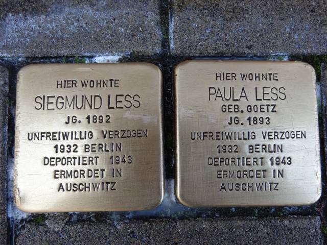 geb. 1892 in Thorn, und Paula Less, geb. 1893 in Hohensalza, geb. Goetz, zogen 1920 nach Lüneburg. Das jüdische Ehepaar hatte ein Schuhgeschäft in Lüneburg. 1932 zogen sie nach Berlin, dort wurde ihr Sohn Herbert geboren. Sigmund Less wurde mit seinem Sohn 1943 von Berlin in das Konzentrationslager Auschwitz deportiert und ermordet. Einen Tag später wurde Paula Less ebenfalls nach Auschwitz gebracht und wurde dort ermordet.