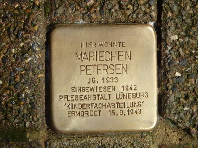 geb. 1933 in Lüneburg, war das zweite von acht Kindern und wurde mit einem Down-Syndrom geboren. Sie wurde sie in die „Kinderfachabteilung“ der Heil- und Pflegeanstalt Lüneburg eingewiesen. Mit hoher Wahrscheinlichkeit starb Mariechen Petersen 1943 als Opfer der „Euthanasie“ infolge einer Überdosis an Medikamenten.
