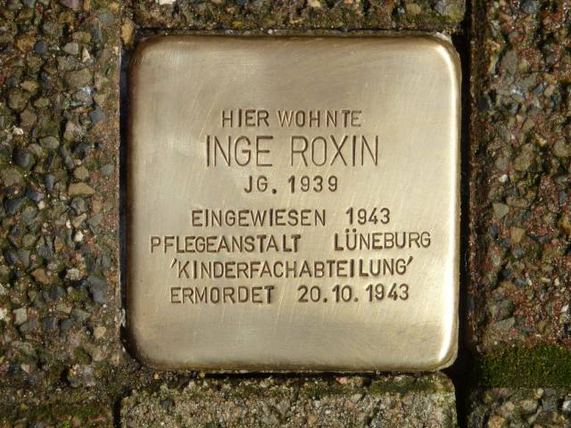 Am 22.11.2019 wurde ein Stolperstein für Inge Roxin (Opfer der „Euthanasie“) in der Rotehahnstraße 4 verlegt.