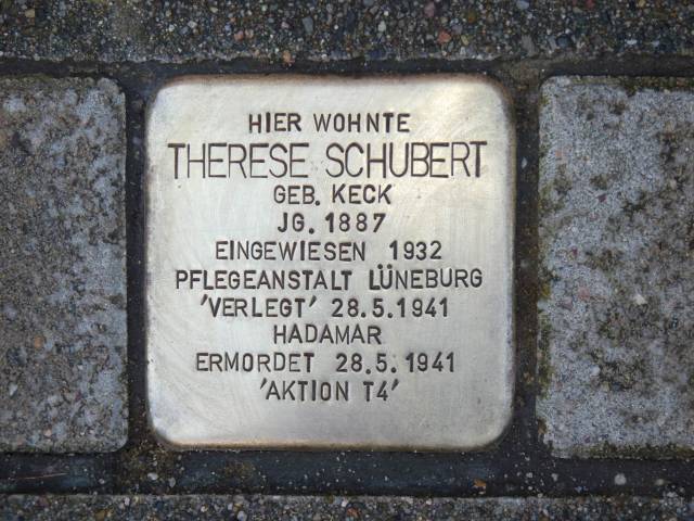 geb. 1887 in Lüneburg, geb. Keck, war Kindergärtnerin. Sie heiratete Heinrich Schubert. Das Ehepaar bekam zwei Kindern. 1926 ertrank Heinrich Schubert in der Ilmenau, danach erkrankte Therese Schubert psychisch, da sie den Tod ihres Ehemannes nicht ertragen konnte . 1932 wurde sie in die Heil- und Pflegeanstalt Lüneburg eingewiesen. Von dort wurde sie über Herborn 1941 in die Tötungsanstalt Hadamar gebracht und ermordet.